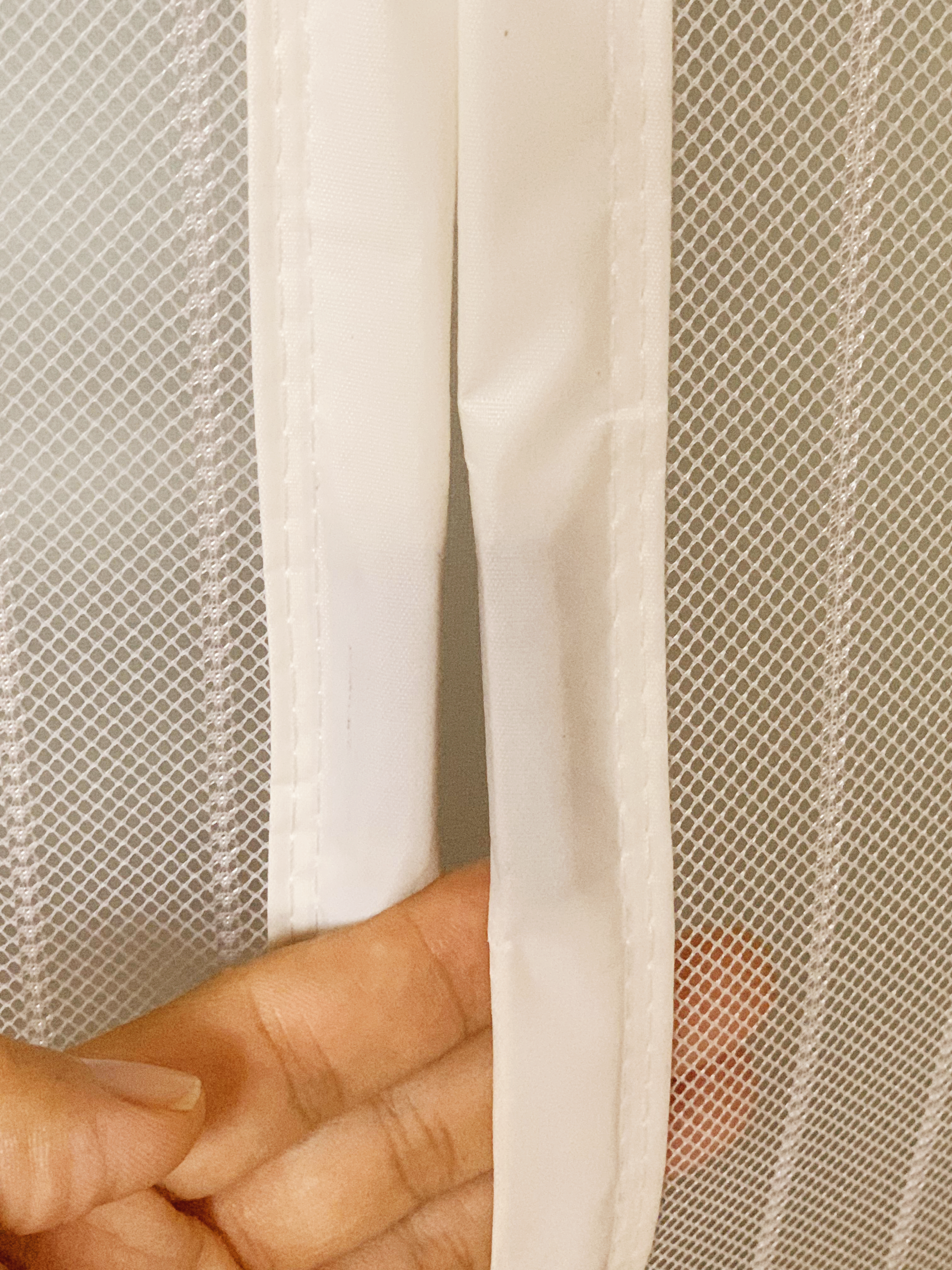 방충망 윗부분의 벨크로가 4cm로 다른 제품에 비해 넓습니다. 이게 생각지도 못했던 장점이더군요. 처음에 살 때는 그냥 '넓어서 튼튼하겠구나'라고 생각했는데, 실제 설치 과정에서 저희 집 현관이 210을 살짝 넘어서 밑부분이 바닥에 닿지 않고 뜨더라구요. 그러면 모기나 파리가 들어오기 쉽잖아요. 그런데 위에 벨크로가 저렇게 넓으니 방충망을 내려서 설치하니 바닥까지 깔끔하게 내려오는 거예요. 이때 제품 만족도가 크게 올라갔답니다.